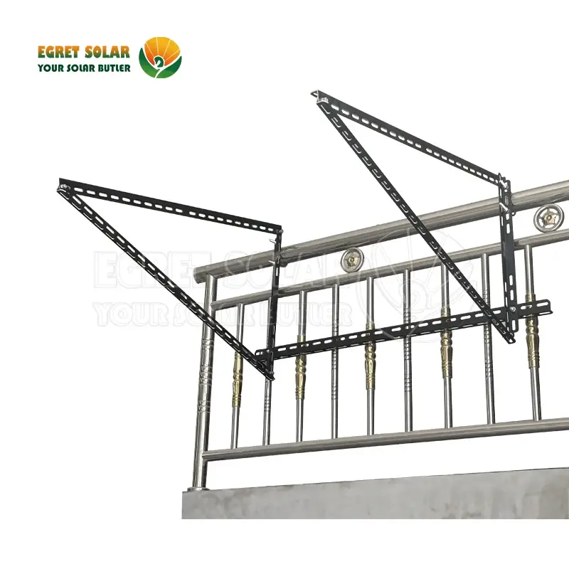 Als uw woning een plat dak of een verticaal dak heeft, kunt u de Opvouwbare Verstelbare Driehoekskantel installeren. Als je hem aan een balkonleuning wilt bevestigen, kun je haken gebruiken. Als het een houten dak is, kunt u zelftappende schroeven gebruiken om de onderbalk vast te zetten. Betonnen daken kunnen worden geïnstalleerd door het plaatsen van gewichten of het gebruik van expansiebouten.