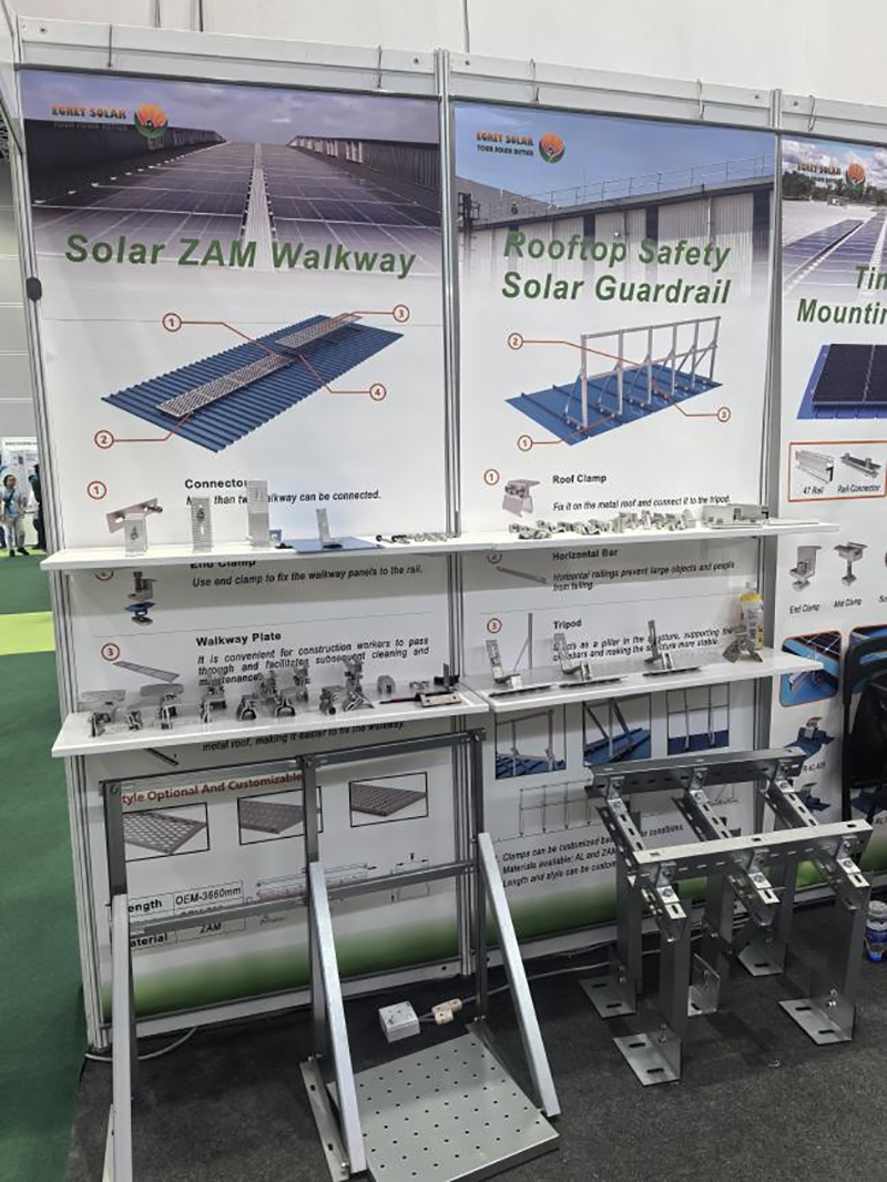 Op de tentoonstelling presenteerden we verschillende dakaccessoires, waaronder klemmen, haken en L-voeten. Klanten kunnen verschillende combinaties kiezen op basis van hun installatieomgeving. Voor kleurgecoate stalen tegels worden klemmen of L-voeten gebruikt, voor keramische tegels worden dakpanhaken op zonne-energie gebruikt. We kunnen de klemmen ook aanpassen op basis van het kleurgecoate stalen tegelmodel van de klant, of de arm van de haak verlengen voor gebruik op locatie.
