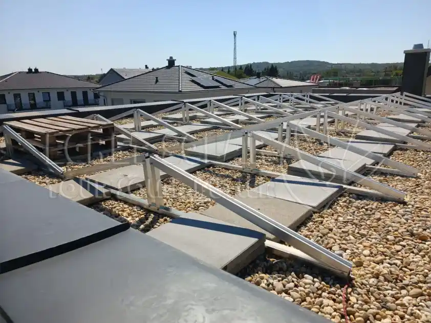 Volgens de tekeningen zijn de voorgemonteerde statiefsteunen in het Solar Flat Roof Mounting System op een afstand van 2500 mm geplaatst.